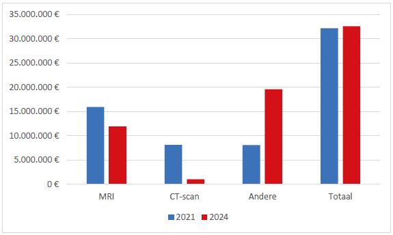 Tegelijkertijd zijn ereloonsupplementen voor andere types ambulante medische beeldvorming, uitgevoerd door een radioloog in een ziekenhuis, sterk gestegen, van 8 miljoen euro in 2021 naar bijna 20 miljoen euro in 2024. Om die reden is het totaalbedrag van de ereloonsupplementen niet gedaald.